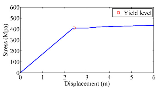 The employed 5 MW wind turbine is illustrated in Figure 1. According to Jonkman et al. [33], the Young’s modulus, shear modulus, yield strength, and effective density of a steel tower are 210 GPa, 80.8 GPa, 408 MPa and 8500 kg/m3 respectively. Although the maximum stress of structural material can be the direct indicator for damage, the available displacement according to criterion is more convenient. Therefore, the static pushover analysis by applying a horizontal displacement load in the FA direction to the rigid nacelle was implemented to obtain the critical displacement. It should be noted that the buckling limit state condition is not explicitly taken into account for the tower model in this paper. The tower base stress to nacelle displacement is shown in Figure 3. The nacelle displacement for the stress at the tower base first exceeding the yield stress is defined as the damage criteria, and the obvious yield level is pointed out in Figure 3. The critical nacelle displacement is 2.418 m. According to [6] and [7], the number of damage criteria is four. In this paper, the purpose is to study the influence of the number of earthquakes on the fragility of modern wind turbines subjected to the coupled excitation of aerodynamic and seismic loads, so only the critical nacelle displacement is chosen as damage criteria.