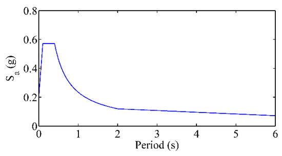 The Taiwan Strait between Fujian and Taiwan has the strongest wind speeds in China [58]. In this area, the site class is II [59], which means that if modern wind turbines are constructed here, they are likely to withstand the coupled excitation of aerodynamic and seismic loads. For the seismic fragility analysis of wind turbines, the actual ground motion records selected from the database were used as loads excitation [6,7,26,27,28,29,30]. The actual ground motion records were used in this paper. For earthquake records, there are many uncertainties such as in magnitude and distance, so selecting the ground motions within appropriate ranges is needed. According to the guideline proposed by Elnashai and Sarno [60], the reasonable ranges of magnitude unit and distance are ±0.3 and ±20–40 km, respectively. The general consensus is to select ground motions so their magnitude and distance are within a close range of the target scenarios. Based on the design response spectrum of the Fujian area [59] (Figure 4), with the calculated magnitude range of 6.0–6.6 and a distance range between 30 and 80 km, 50 earthquake records were selected in strong-motion database of the Pacific Earthquake Engineering Research Center (PEER) [61]. The characteristics of selected records can be found in Table A1.