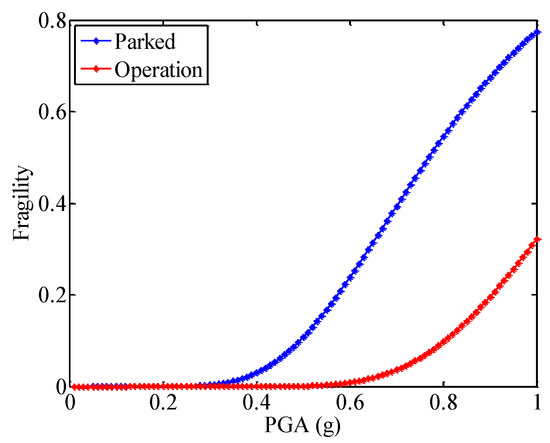 During the simulation, each ground motion was applied at 400 s. Jalayer [34] pointed out that the statistical information can be provided by the results of MSA through scattering the multiple stripes with constant IM (PGA). Next, the fragility curves of the 5 MW wind turbine subjected to coupled excitation of aerodynamic and seismic loads for the two scenarios were obtained based on the Equations (11) and (13), and shown in Figure 6. There is a great difference between the two scenarios for the fragility curve in Figure 6. In a normal operation condition, the probability of exceeding the damage state is significantly less than that in the parked condition with the same PGA. The loads on the structure in the normal operation condition with a power control system working may be reduced compared with the parked condition. According to Asareh et al. [53,54] and Valamanesh and Myers [63], the coupling of aerodynamic and seismic loads will encounter the aerodynamic damping, which will reduce the dynamic response of wind turbines. This is because the aerodynamic damping is affected by the rotor speed , the instantaneous local angle of attack , the drag coefficient , the lift coefficient , and the derivatives of and with respect to [63]. Therefore, the aerodynamic damping in the normal operation condition is larger than that in the parked condition caused by the changing rotor speeds and pitch angles in normal operation condition [6,7], which causes the probability of exceeding the damage state in normal operation condition is less than that in parked condition with the same PGA. Through comparing the fragility curves between the two scenarios, it can be concluded that the coupled excitation has a great influence on the fragility of modern wind turbines. Therefore, the influence of the number of earthquake records on the fragility of modern wind turbines subjected to the coupled excitation of aerodynamic and seismic loads may be different with building structures, and it is necessary to study the number of ground motions to obtain an accurate fragility estimation of modern wind turbines under coupled excitation.
