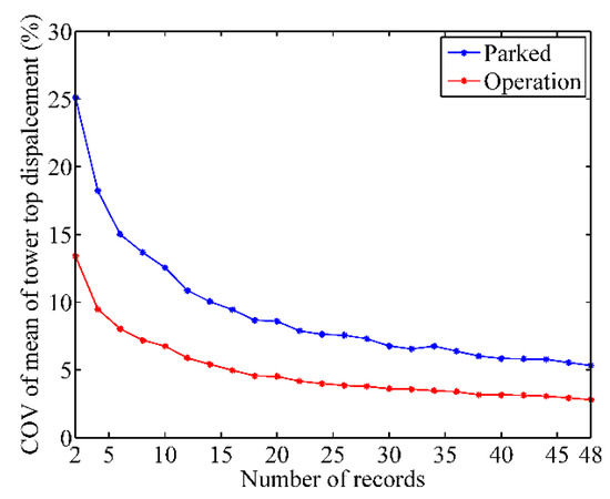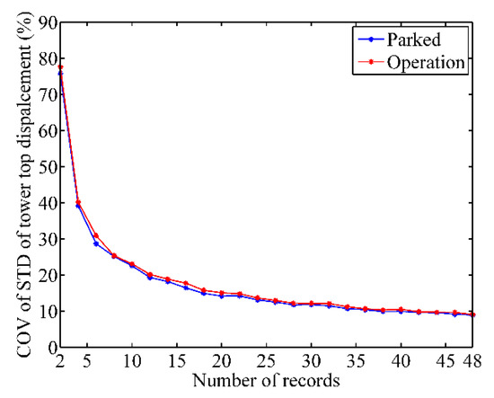 When developing the fragility function, it is essential to collect the maximum FA tower top displacement from many dynamic analyses with different IMs. From the set of 50 ground motions, it is possible to randomly select two earthquake records and then obtain the standard deviation (STD) and mean values of maximum FA displacements. In this case, the choice of the two records will affect the values of STD and mean, so we randomly selected 1000 groups without repetition and could obtain 1000 mean and STD values for the two records. Then the coefficient of variation (COV) of STD and mean values can be calculated for the two records. In the same way, the COV of STD and mean values can be obtained for more than two records. For the two scenarios, the relationship between the number of earthquake records and the COV of the mean value of maximum FA displacement is calculated by repeating the same way for up to 48, spaced at two records. And the comparison of the COV of the STD of maximum FA displacement with a different number of earthquake records between the two scenarios is shown in Figure 7. The COV of the mean decreases tends to be stable with the number of ground motions increased for both the two scenarios in Figure 8. However, the value of COV in the parked condition is larger than that in the normal operation condition when the number of records is the same, which means that it needs a greater number of records in the parked condition than that in normal operation condition to reach the same COV. In Figure 7, the trend of the number of records with the COV of STD is the same as the COV of the mean, which tends to be constant as the number of records increases. It is also noted from Figure 7 that there is a slight difference between the two scenarios for the COV of STD.