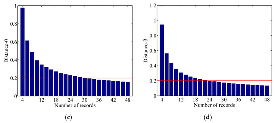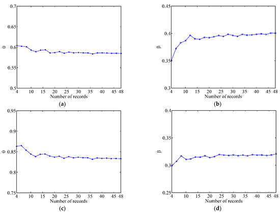 The estimated and versus number of records: (a,b) for parked condition, and (c,d) for normal operation condition.