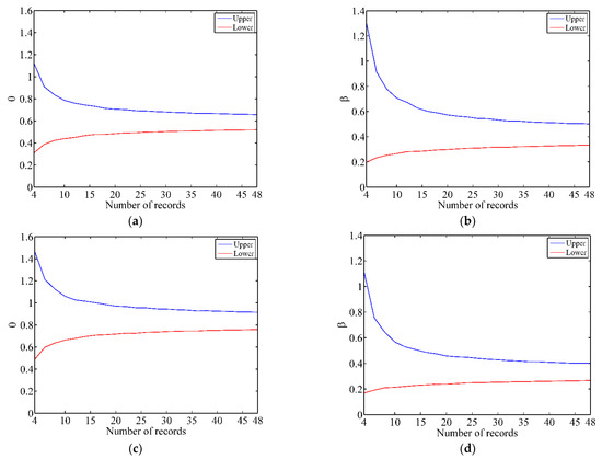 The scope of lower and upper 95% confidence interval for estimated and with different number of records: (a,b) for parked condition, and (c,d) for normal operation condition.