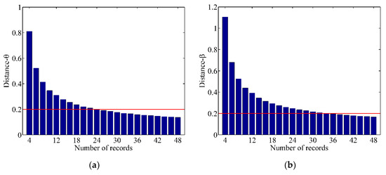 The influence of the number of ground motions on the 95% confidence interval for estimated parameters and is studied to obtain a sufficient number of ground motions for accurate fragility estimation. For each number of ground motions from 2 to 48, the 1000 random different groups of records same within Section 4.1 and Section 4.2 were selected and the confidence interval of the estimated parameters with the same 95% probability for each group was developed. The lower and upper value corresponding to a 95% confidence interval for the estimated values of and in each group can be calculated by utilizing Equations (14) and (15) [64] based on distribution and distribution.