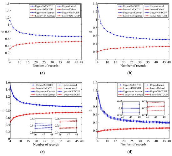 Four spectral models, Kaimal model [5], NREL National Wind Technology Center (NWTCUP) Model [62], Risø smooth-terrain (SMOOTH) model [65], and Von Karman model [5], were used to study the influence of the wind spectrum on the sufficient number of ground motions. Using the same approach as in Section 4.3, the average of the lower and upper 95% confidence interval with a different number of ground motions for the other three wind spectra (the Kaimal model was used in Section 4.3) and the comparisons between the four wind spectra for estimated and are shown in Figure 12. Figure 12a,b show that the related curves for the four wind spectra are completely consistent, which means that the wind spectrum has no influence on the sufficient number of earthquake records for a 5 MW wind turbine subjected to the coupled excitation of aerodynamic and seismic loads in the parked condition. Figure 12c,d show that the related curves for the four wind spectra are slightly different, which means that the wind spectrum has a slight effect on the sufficient number of earthquake records for a 5 MW wind turbine to coupled excitation of aerodynamic and seismic loads in the normal operation condition. The reason for this phenomenon is that the aerodynamic loads are very small in the parked condition and the coupling effect is obvious in the normal operation condition. The effect of the wind spectrum on the sufficient number of earthquake records was also presented by giving the specific number of earthquake records obtained in the same way with Section 4.3 in Table 2 where the decisive number for each spectrum are marked in bold.
