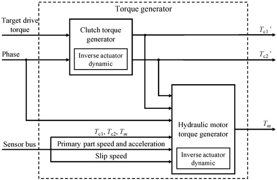 The control framework based on the torque based control consists of a target torque generator, a powershift controller, an actuator dynamic module, and a power train model. The schematic diagram is shown in Figure 3.