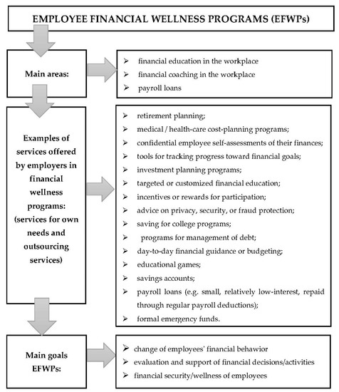 EFWPs are thought to have emerged as a distinct model of employee benefits, which marks a paradigm shift in both the purpose and substance of benefits. The traditional role of employee benefits is changing because organisations are taking an increasingly holistic approach to promoting employee financial security. A similar definition implies that financial well-being is “financial security for achieving life goals” [25]. Financial well-being is influenced by personal characteristics, financial literacy, financial behaviour, financial circumstances and financial stressors [44]. Hannon, Covington, Despard, Frank-Miller, and Grinstein-Weiss [45] note that the term EFWP is defined inconsistently in the field. It is often used to describe a range of financial products and services offered by employers, and these offerings may or may not support employees’ overall financial well-being. Typically, it refers exclusively to pension and insurance education for employees administered by large providers. In contrast, EFWP vendors and advocates of financial wellness benefits offer a more expansive definition of such programs. Unlike conventional financial education programs (e.g., financial workshops) and typical workplace benefits (e.g., education on retirement. insurance plans), EFWPs often combine elements in a way that “assesses and supports” employee financial wellness [33,46]. The programs do not offer a uniform array to all employees but are rather personalised, based on acquired information and aimed at changing employee behaviour [47]