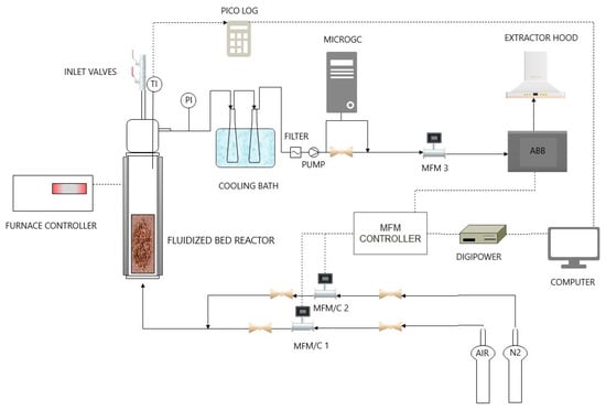 The layout of the lab-scale plant is depicted in Figure 1. There was a quartz fluidized bed reactor, placed in a cylindrical electric furnace, fed upward by nitrogen or a mixture of nitrogen and air. Inlet gas flowrate is set manually or by PC, using the Bronkorst El-Flow control unit.