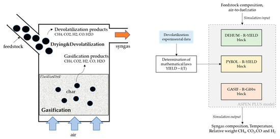 A simple schematic of the fluidized bed reactor is reported in Figure 2 (LHS). As stated in previous literature [,], in fluidized bed gasifiers, the devolatilization step occurs at the top of the reactor as soon as the feedstock enters the chamber. The remaining feedstock, namely the char, falls into the bed where the oxygen (air) is fed from the bottom and reacts with it. Given the sub-stoichiometric conditions, one can assume that most of the oxygen is consumed by the char transported by the bed. The modeling approach chosen to represent these physics is shown in Figure 2 (RHS).