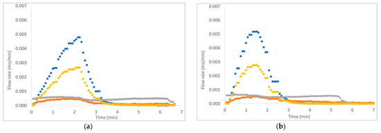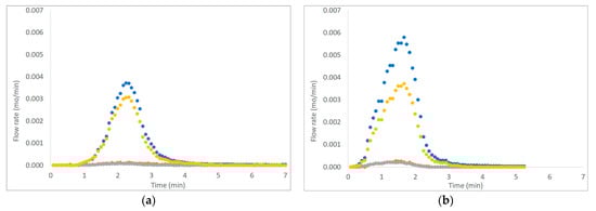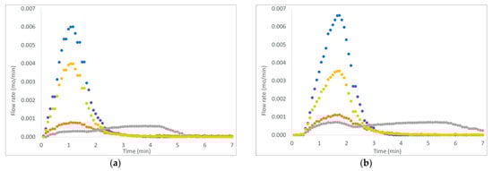 Figure 3, Figure 4 and Figure 5 show six examples of devolatilization tests at 700 °C, for each combination of material kind and fluidizing agent. As already noted by Di Giuliano et al. [], for similar experiments on biomass pellets, gaseous products (H2, CO, CO2, and CH4) released by the unsteady state process determined the characteristic asymmetric shape of Fi,out (t) peak.