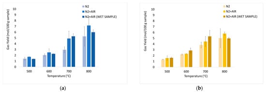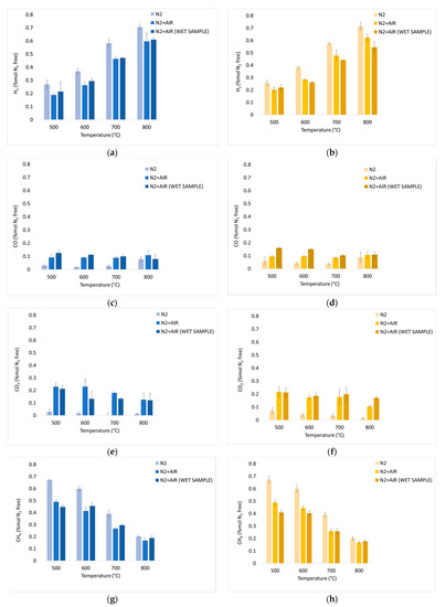 Example of H2, CO, CO2, and CH4 outlet molar flow rates (Fi,out) as functions of time (t), produced by devolatilization tests of (a) wet chirurgical masks and (b) wet FFP2 mask, in a fluidized bed reactor at 700 °C, in nitrogen and air atmosphere. (● H2, ● CO, ● CO2; ● CH4).