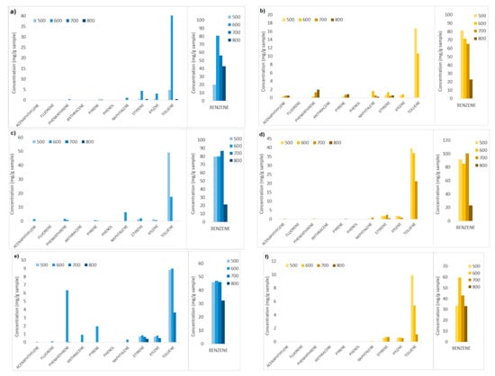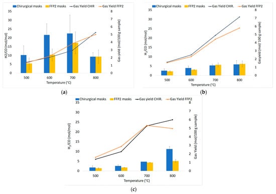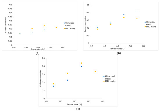 In a nitrogen atmosphere, there is a reduced amount of oxidized compounds compared to CH4 and H2, resulting in a high H2/CO ratio (22.46 mol/mol for chirurgical masks). On the other hand, when air is added to the inlet gas mixture, oxidized compounds (CO and CO2) are developed. For carbon conversion, the highest values are obtained at 700 °C and 800 °C, however, these do not exceed 50%, and this is attributable to the rapid condensation of vaporous products, which are exposed to room temperature both on the reactor head and in the piping before condensation zone, results in a very viscous residue in pipes, similar to tar, which causes blackening and obstruction; Aromatic HCs generated in the devolatilization tests were analyzed and quantified by GC-MS; the results show that benzene and toluene are the most abundant compounds generated (50 to 100 mg/gsample), while heavy HCs are present in very low quantities (<10 mg/gsample). In particular, tests carried out at higher temperatures (800 °C) and with wet samples presented the lowest contents of aromatic HCs produced. In particular, for these conditions, both FFP2 and chirurgical mask samples gave a total HC content of approximately 33 mg/gsample composed exclusively of light 1-ring compounds.