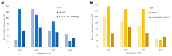 Proximate analysis was adapted from the standard test method, ASTM E1131-20 (used for coal, lubricant, polymers, etc.) []. It led to the determination of medium volatile, highly volatile, combustible material and ash and contents setting the first treatment in nitrogen atmosphere (3 Nl h−1): (i) 10 °C min−1 heating ramp-up from room temperature to 150 °C; (ii) 10 °C min−1 heating ramp-up from 150 °C to 600 °C (iii) 10 °C min−1 heating ramp-up from 600 °C to 750 °C; followed by treatment in air flux (3 Nl h−1): (iv) 10 °C min−1 heating ramp-up from 750 °C to 800 °C, respectively.