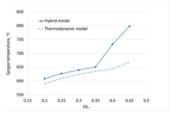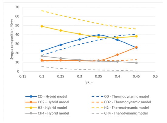 The results of the model were compared against the results of a simple thermodynamic-equilibrium model, based on the same assumptions, and developed in Aspen Plus ®. The thermodynamic model was based on an approach widely used in the literature [] where pyrolysis and gasification are combined in a single step after decomposing the feedstock based on its elemental composition. The syngas composition is found as the one minimizing the Gibbs free energy. The comparison was carried out by fixing the feedstock composition and varying the equivalence ratio (ER) between air and fuel. The simulations were carried out with air with a lower oxygen content than normal air (10 %wt. O2, 90 %wt. N2), to keep the gasification temperature within the range 500–800 °C, which is the range of validity of the obtained devolatilization laws.