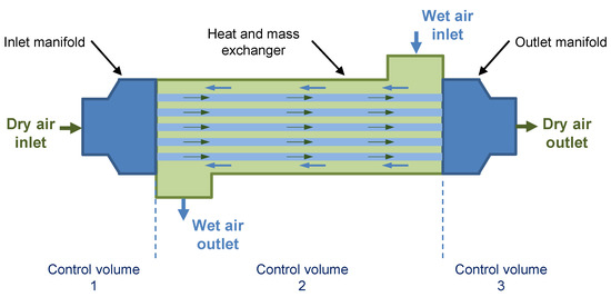 The humidifier module was divided into three control volumes: (1) the inlet manifold that takes the supply air and distributes it to the membrane tubes; (2) the heat and mass exchanger, which includes the membrane bundle comprising tubes housed in a shell; and (3) the outlet manifold that exhausts the moist air from the humidifier. Control volume 1 was used to study the heat transfer from the internal flow to the manifold and outside ambient air. Control volume 2 was used to study the heat and mass transfers between the two flows. Similar to control volume 1, control volume 3 was used to study thermal transport phenomena. The output of control volume 1 was a dry flow, which was the input for control volume 2. The flow characteristics output by control volume 2 were the input parameters for control volume 3.
