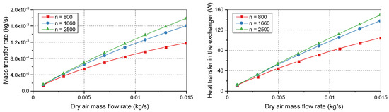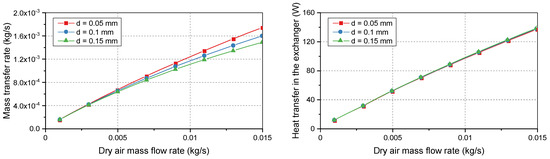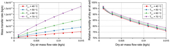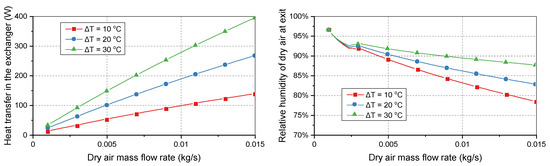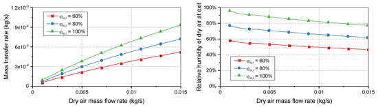 The mass transfer rate can also be used to calculate the mass of the vapor and thus the specific humidity in each flow. Because the temperature, pressure, and specific humidity are given, the relative humidity of the dry flow at the outlet of the exchanger can then be determined by using Equation (11).