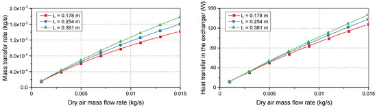 The developed model was used to predict the humidifier performance when the membrane dimensions change. The effects of the membrane thickness, length, and number of tubes on the heat and mass transfer rates were studied. Figure 5 shows that longer membranes improved both the vapor transport and heat transfer. Three standard membrane lengths were considered for the bundle: 0.178, 0.254, and 0.381 m. At low flow rates, the heat and mass transfer rates had similar values. However, the curves deviated when the dry air flow rate was increased. At low demand, the three membrane lengths easily achieved the maximum possible heat and mass transfers between flows. Therefore, the curves coincided at the beginning of the simulation range. At heavier loads, deviations occurred because longer membranes supported a larger surface area for increased transport.