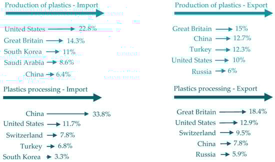 Figure 9 illustrates the circularity of plastics (production, conversion, recycling, with aspects of exports and imports) [13].