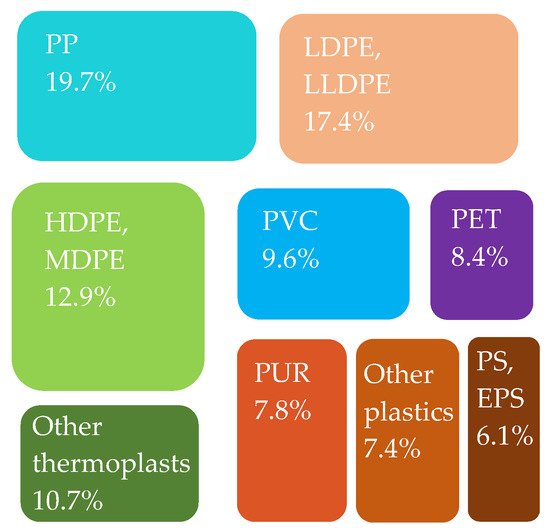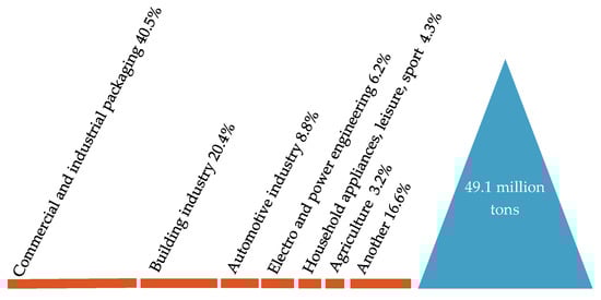 In Europe, the packaging sector uses 39.7% of all plastics. The second largest sector of using plastics is the construction industries, whose share in the total consumption of plastics is 19.8%. The automotive industry is in third place with a share of 10.1%. Applications of plastics in the electrical and electronics industries account for 6.2% of overall plastics consumption, the household appliances for 4.1% and agriculture for 3.4%, relatively. In other application areas, including household appliances and equipment, furniture or medical devices, together, 21.7% of plastics are consumed [3,10,11].