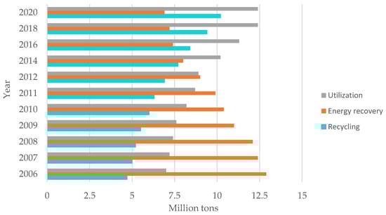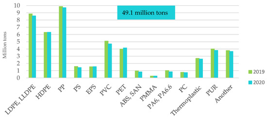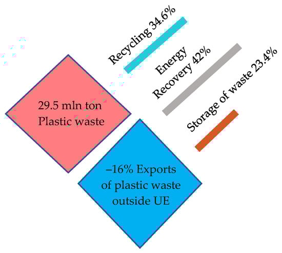 In recent years, the amount of plastic waste recycled has increased, with simultaneous decrease in the amount of waste going to landfills and the maintaining the level of waste destined for energy recovery. For example, in 2020, nearly 10.2 million tons of waste of plastic was recycled and stored [3].