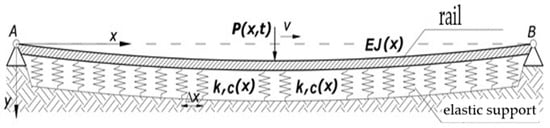 Based on the analytical and numerical considerations, a computational model was created, thanks to which it is possible to determine the impact of various variants of the rail support on the dynamic response of the entire structure. The starting point for the deliberations was the Bernoulli–Euler beam. The dynamic load caused by the passage of a multiaxle rail vehicle and different vibration-damping properties of different types of surfaces are taken into account. As a consequence, the fourth-order differential equation was obtained. It was solved by the finite differences method. A script in MATLAB was developed for a numerical solution of the problem.