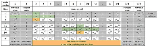 An explicit method of searching for solutions on the time–space grid of the finite differences method was used []. The new value (orange in Figure 3) is based on the values already known, calculated in the previous steps (green). The first unknown to be calculated is . This is the vertical displacement of the first node located on the rail course at the first considered time moment (orange color). For the first calculation, therefore, five values from the time moment (j = 0, green color) and one fictitious value from the time moment (j = −1, green color) will be used. This shows how important it is to correctly give the initial condition, because otherwise any data taken into account for the first calculation would be equal to 0.