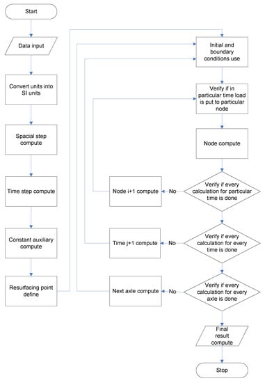 The scheme of operation of the created algorithm in relation to individual nodes “i” and time moments “j” is presented in the differential time–-space grid shown in Figure 3. An explicit method of solving differential equations was used [], in which it is important to properly give the initial conditions of the calculation process.