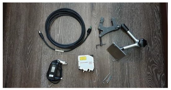 The research was possible thanks to cooperation with P.P.H.WObit E.K.J.Ober s.c. (https://wobit.com.pl/en) (accessed on 11 March 2022). This company made the laser scanner of the scanCONTROL LLT2610-50 series available for testing free of charge under a loan agreement concluded with the Faculty of Civil Engineering and Geodesy of the Military University of Technology in Warsaw. The measuring set included the following elements: (1) laser scanner of the scanCONTROL LLT2610-50 series, (2) a tripod with mounting screws enabling permanent fixation of the measuring device, (3) a power set, and (4) a cable enabling the scanner to be connected to a computer. The scanner allows to measure up to 2,560,000 points per second at a frequency of up to 4000 Hz. Measurement accuracy is 2 μm. The scanner is enclosed in a metal casing, which ensures an IP65 degree of protection. At the bottom of the scanner there is a light source and a receiver. There are two connectors on the housing: (1) Ethernet (used to communicate with a PC or Plc controller) and (2) multifunctional (used, among others, for power supply). To communicate the device with a computer, a cable with an RJ45 connector on one side and a connector dedicated to the scanner on the other [] is used. For the proper operation of the entire measuring system, one needs a computer with the appropriate software installed and a power generator providing a constant power source. Before starting measurements, it is necessary to check the correctness of the scanner’s connection with the computer, select the appropriate software configuration and assign it to the device, as well as define the scanner’s work settings by setting parameters such as exposure time and the number of measured profiles per second. In selection of the correct parameters, a preview of the measurement, which is displayed in real time, in one of the software modules, is helpful. In addition, one must specify a name and location to save the result file. The recording is made automatically after the measurements are completed. The scanner measuring set is shown in Figure 5.