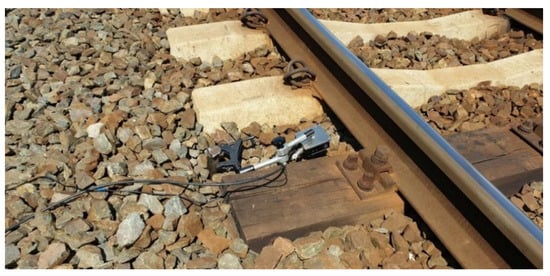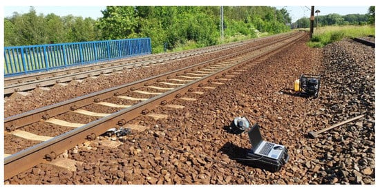 The scanner was placed transversely to the track axis, so that the infrared radiation it sent was directed at the rail foot. The holder with the scanner was each time mounted on a metal rod about 0.65 m long driven into the railway crushed stone in a way that prevented any movement of the measuring system. The measuring stations are shown in Figure 6, Figure 7, Figure 8 and Figure 9.