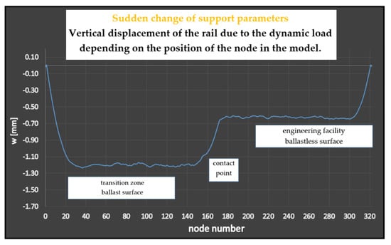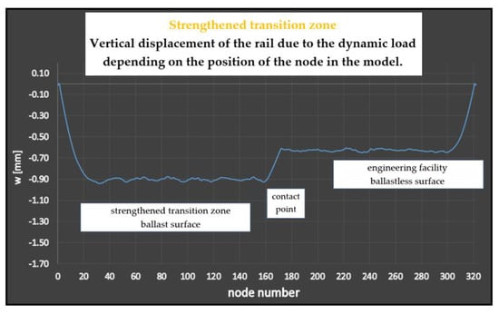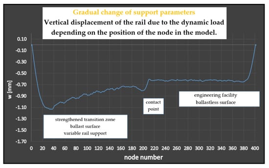 The dependence of the maximum vertical displacement of the rail caused by the dynamic load depending on the position of the node in the model in the case of a gradual change in the elasticity of the rail support within the transition zone.