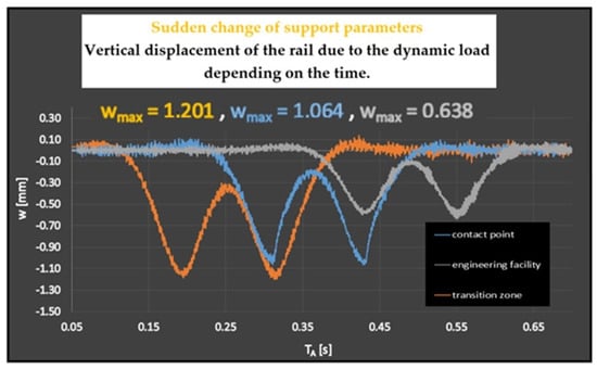Vertical displacement caused by dynamic load, depending on time in the case of a step change in the parameters of the structure for three different nodes: 1. node on the transition zone (ballast surface), 2. node in the place of a jumping change in the parameters of the structure (connection of the surface), and 3. node on the engineering object (ballastless surface).