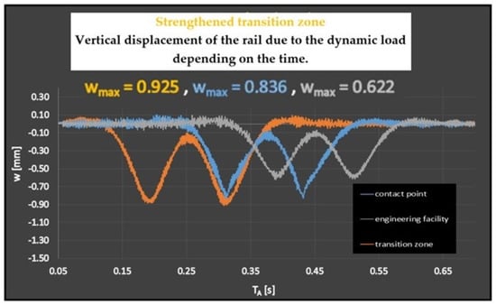 In order to compare the impact of the reinforcement of transition zones and the gradual change in the elasticity of the rail support on the reduction of the magnitude of dynamic interactions on the railway surface, the calculated results were tabularly compiled. Table 4 contains the maximum values of vertical displacement of the rail at critical points within the place of change of the type of surface (from ballast to ballastless) i.e., (1) just before the point of change and (2) just after the point of change.