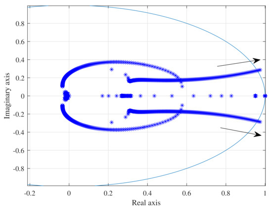 In Figure 9, the Floquet multipliers due to the droop characteristics variation in the DG1 control is shown. It is found again that the system becomes unstable via a pair of complex Floquet multipliers, which means this system has a Neimark–Sacker bifurcation; however, in this case the system becomes unstable before () as compared with the fundamental frequency case. On the other hand, it can be seen that the Floquet multipliers trajectory dynamics are completely different from the previous case.