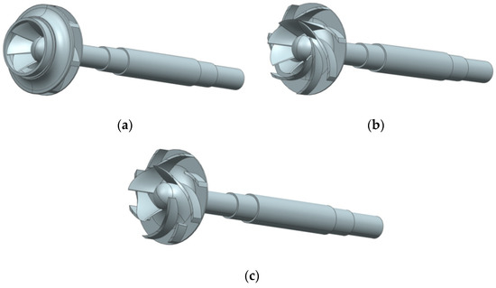 The rotor system mainly includes the impeller, pump shaft and other rotating parts. The rotor system of pump case A mainly includes vanes, the shroud and hub as well as rotating shaft; the case B and case C rotor system includes corresponding vanes, hub, and rotating shaft. The structures of the model pump impeller rotor system are shown in Figure 3.