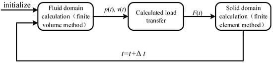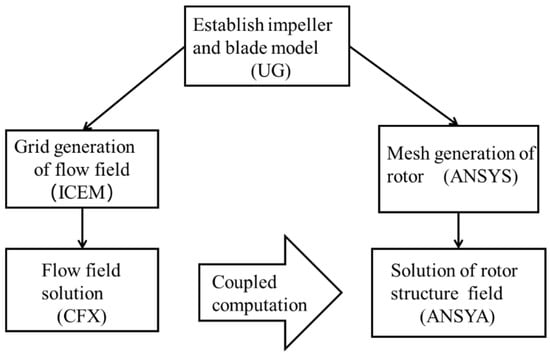 In the dynamic research, because the fluid medium has a great influence on the vibration characteristics of the rotor, the wet modal analysis of the rotating subsystem was carried out based on the acoustic-structure coupling method. An acoustic (ACT) plug-in was added in ANSYS Workbench software, the surface where the impeller and fluid are in contact with each other was set as a fluid-solid interface, and the pressure load generated by the fluid is applied to the structure. The fluid is an acoustic fluid with a sound speed of 1430 m/s and a fluid density of 1000 kg/m3. The flow chart of the fluid-structure coupling calculation is shown in Figure 6.