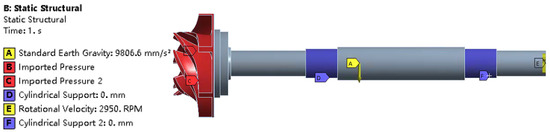 The material of the rotor system is HT250, with a density of 7350 kg/m3, Young’s modulus of 130 GPa, Poisson’s ratio of 0.25, yield strength of 250 MPa. Basic material properties are added to Static Structural by selecting Engineering Data. Constraints and load related settings of the impeller rotor structure are shown in Figure 5.