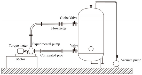To verify the accuracy of the numerical simulation results, a closed hydraulic test rig was set up. Figure 7 shows the test bench site plan. The test system consists of two parts: a water circulation system and the data acquisition system. The closed test rig water circulation system includes a vacuum pump, reservoir, frequency converter, stainless steel pipeline, corrugated pipe, motor, test stand, test pump, inlet valve, and outlet valve. The data acquisition system consists of the data acquisition program, data acquisition card, data transmission line, and data acquisition equipment. The data acquisition card model used in this test is NI USB 6343X, which has 32 built-in analog signal input channels to meet the measurement requirements.