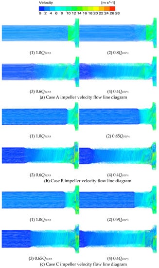 Representative flow rates under each case are selected for analysis; in which 1.0 QBEPA represents the best efficiency point of the centrifugal pump. In order to facilitate the analysis, the impeller of pump case A was taken as an example to analyze the change in inlet backflow with flow rate. It can be seen from Figure 8 that uniform flows are distributed at the 1.0 QBEPA flow rate, no backflow occurs, the velocity is distributed throughout the inlet tube area from the inlet of the inlet tube to the impeller inlet. When the flow rate drops to 0.8 QBEPA, the flow line at the inlet of the impeller is disordered. At this time, the inlet backflow starts to grow but with low intensity. When the flow rate drops to 0.6 QBEPA, the inlet distribution flow becomes uniform and more vortex is found. When the flow continues to decrease to 0.4 QBEPA, the backflow strength is further enhanced.