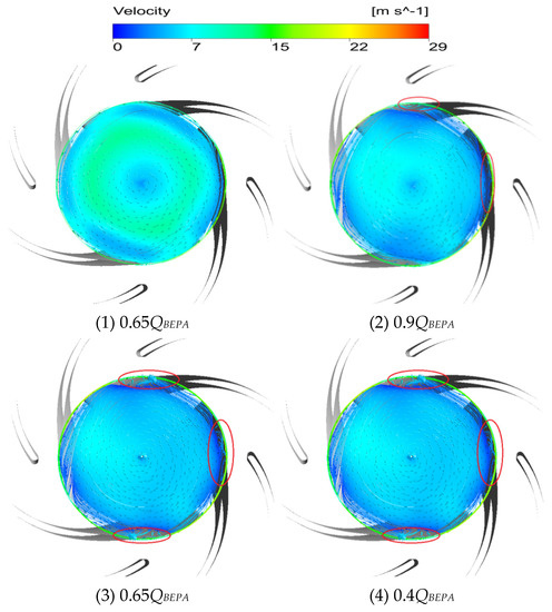 As the split blade impeller has the highest backflow intensity, pump case C is chosen to analyze the two-dimensional velocity at the blade inlet cross-section. It can be seen from Figure 9 that in 1.0 QBEPA flow rate, the flow line at the blade inlet cross-section is relatively flat; the flow rate drops to 0.9 QBEPA, the blade inlet cross-section outer edge appeared with the blade rotation direction of the same backflow vortex, at this time the backflow vortex only appear in the inlet edge of a very small range. Flow further down to 0.65 QBEPA the influence of the vortex range expanded, while in the section below the edge of the new backflow vortex. When the flow rate continues to drop to 0.4 QBEPA, the influence range of the backflow vortex at the blade inlet is further expanded, and the nucleus of each backflow vortex gradually approaches the centerline of the impeller.