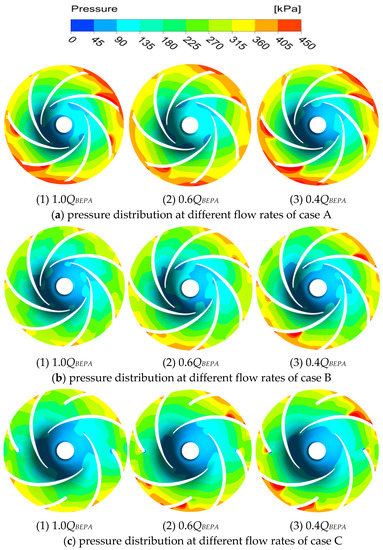It can be seen from Figure 10 that the static pressure in the impeller increases gradually from the inlet to the outlet, and the pressure gradient is obvious. The pressure in the impeller is asymmetrical. The lowest pressure is located on the blade suction surface in the center of the impeller. As the flow decreases, the total pressure in the cross section of the impeller increases. The low-pressure areas on the blade suction surface increase downstream. At the small flow rate, the pressure area at the impeller outlet increases. The pressure difference between the impeller center and impeller outlet is more obvious. By comparing the pressure distribution of the three different impeller structures, it can be observed that the overall pressure value of the cross section of the impeller at each flow rate in Case B and Case C is lower than that in Case A.