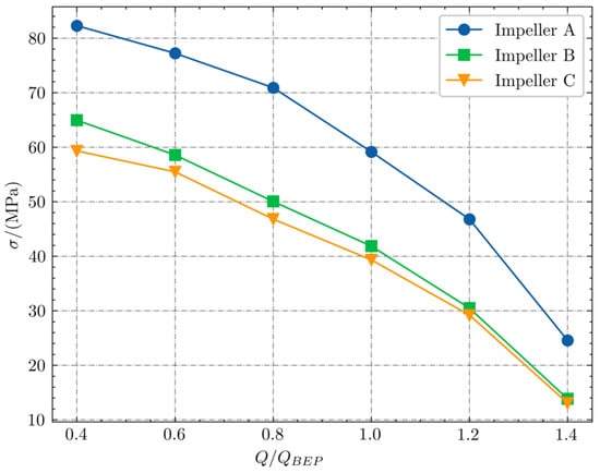 Curves of maximum equivalent stress of different impeller rotors with flow.