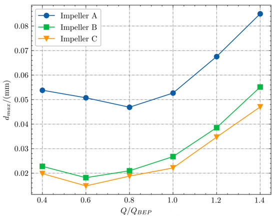 As indicated in Figure 13 at the optimal flow rate, the change in deformation amount is minimal because of the stable flow and the minimum radial force at the optimal flow rate. The maximum deformation of each impeller case increases significantly when it deviates from the optimal flow rate. Therefore, to ensure the stiffness requirements of the impeller rotor during operation, deviations from optimum flow rates should be avoided. The maximum deformation varies greatly among different impeller cases. Among the three impeller cases, case A has the largest maximum deformation at each flow rate and the maximum deformation is 0.085 mm, followed by case B and case C.