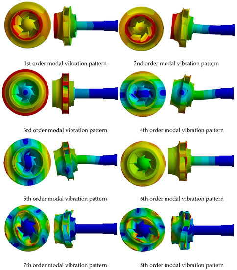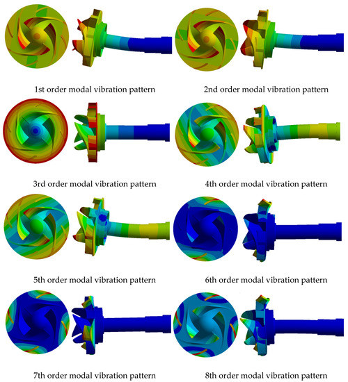 In the centrifugal pump rotor system of case C, the first two modes are axial swing and deformation swing. The deformation makes the maximum vibration position of the impeller symmetrical distribution according to the swing axis. The center axis of the two modes is a 90° angle. The third mode is the twist deformation around the rotating axis of the impeller. The fourth and fifth modes are mainly oscillating deformation, and their oscillating directions differ by 90°. The sixth, seventh and eighth modes are the twisting deformation along the rotating axis of the impeller. Large vibration deformation appeared at the exit of the impeller, and there was no strong vibration deformation inside the impeller.