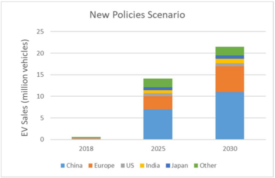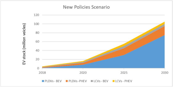 There are currently about 11 million electric cars in the world which, according to the Stated Policies Scenario (STEPS), will become about 145 million by 2030, with an annual growth rate of about 30%. These forecasts consider the current energy policies and the disbursements of the manufacturers in the sector. The forecasts for electric cars in terms of the total number of vehicles registered in the world should be around 7% by 2030. In particular, it is expected to sell about 15 million electric vehicles in 2025 and over 25 million in 2030 [3]. In 2030, global EV sales will reach 23 million and the stock will exceed 130 million vehicles in the New Policies Scenario. Figure 1 and Figure 2 report these scenarios [4].