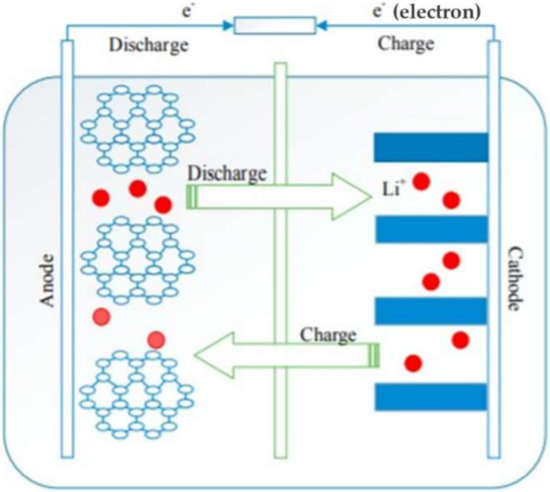 In Li-ion batteries (see Figure 3), unlike lithium batteries, the metal lithium anode, which presents safety and reactivity problems, is replaced with an inserted anode capable of accumulating and exchanging a large amount of lithium ions. In this way, the ions can access he electrode more easily; since there is a lower internal resistance, consequently the battery is able to absorb more power. A lithium-ion battery can consist of different types of electrodes and electrolytes, with voltage, energy density, and power density being very different from each other, in order to adapt to the specific application. The LiFePO4, Li-Titanate [12] electrodes are those able to guarantee greater safety, which, however, cannot be considered absolute; hence, the need to use a control system capable of managing the charge and discharge of the battery itself.