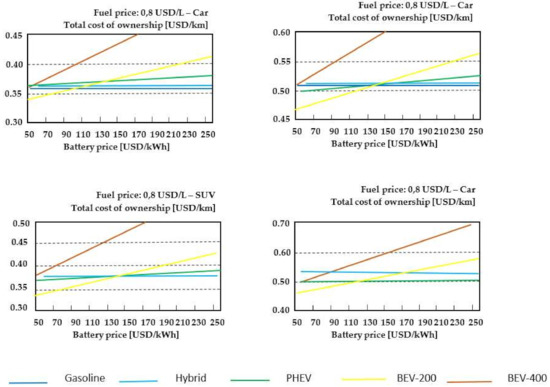 In the case of an autonomy of 400 km, the electric car is advantageous compared with the petrol car only if the cost of the batteries is equal to 70 USD/kWh [9], as shown in Figure 5. Table 2 reports this comparison [8,13].