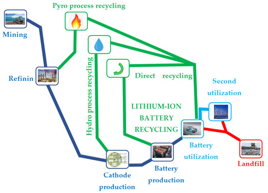 In order to mitigate the environmental impact of electric car batteries once they have reached the end of their useful lives, a circular economy model for recycling and reusing waste as inputs again is required [16]. Figure 7 shows different sustainable end-of-life options for batteries. The common end-of-life procedure includes the following steps: