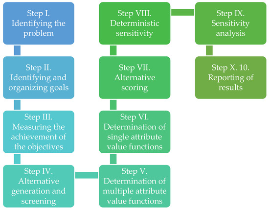 In order to determine the impact of the analyzed factors, the structures of electricity consumption of households, innovation expenditure, changes in electricity prices and economic growth with the level of CO2 emissions between individual European Union (EU) countries were compared using the multiobjective decision analysis (MODA) with the single attribute value function (SAVF). These methods were chosen because of some very complex issues involving multiple criteria and multiple parties that can be profoundly affected by the outcomes of decision. Multi-Objective Decision Analysis (MODA) is the decision-making process when there are very complex issues, including many criteria and many pages that can be profoundly influenced by decision outcomes. This will allow consideration and weighing of factors and tradeoffs when evaluating each alternative (in this case, quarterbacks entering the draft). The groups then discuss the combined group results to help make a decision about the recommendation. The MODA analysis I conducted consisted of ten steps, which are shown in Figure 2. These are the various stages of the research.