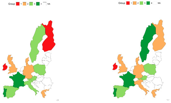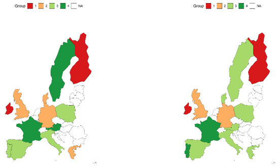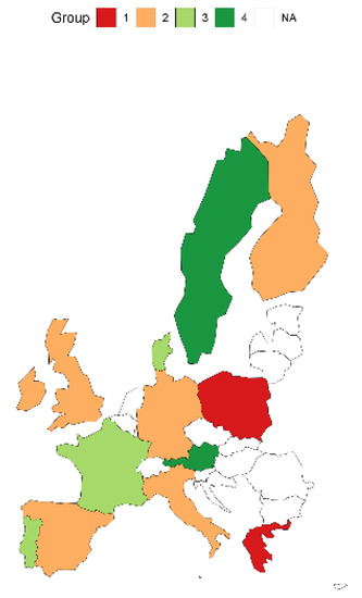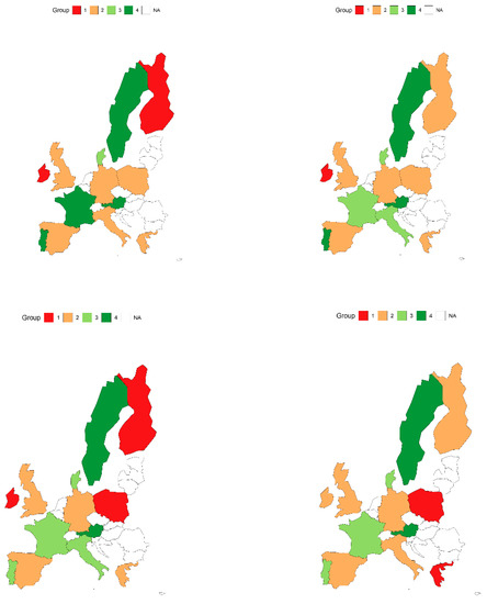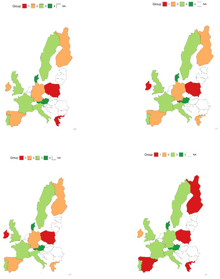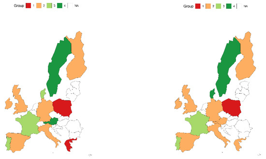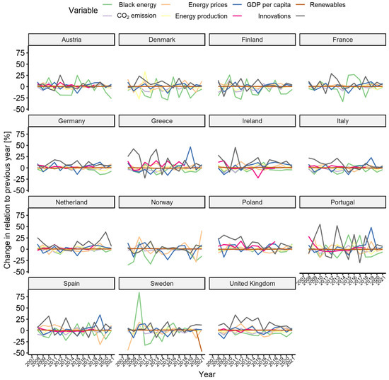 Analysing the percentage changes of the studied indicators in each country (Figure 2), one will notice significant differences in this process. In terms of the use of black energy, the greatest progress was achieved by Denmark, which reduced this consumption by more than 79.43% in the examined period. The most insignificant changes in black energy consumption were achieved by Poland (−4.59%) and the Netherlands (−6.20%).
