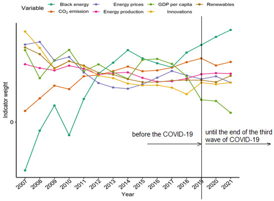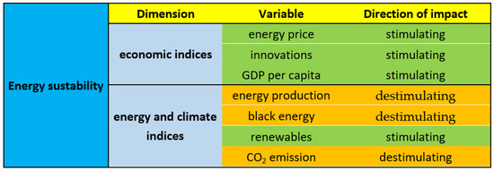 Next, appropriate variables were assigned to each dimension. Economic indices included: energy price, innovations, and GDP per capita, while the energy and climate included: energy production, black energy, CO2 emissions and the use of Renewable energy sources (Figure 4). The stimulating or de-stimulating character of the variables was also taken into account. The first group includes the following factors (the higher their value, the better):