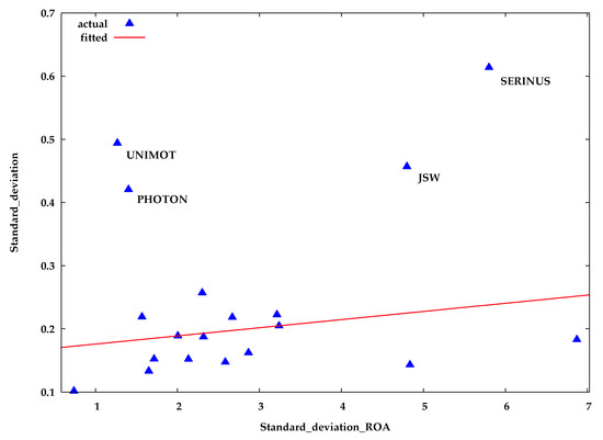 The graph in Figure 1 shows that quantile regression is much more robust to outliers compared to the OLS method. It plots the outliers for the quantile regression equation for the median (50th quantile) based on the magnitude of residuals in excess of 2.5 standard errors. However, note that only anomalies in the conditional distribution of dependent variables can be detected in this way. Four companies that turned out to be outliers were signed. They form two separate groups. The first one, consisting of JSW and SERINUS, confirms the relationship observed in the quantile regression model. These companies have a high total market risk with a high level of total accounting risk. The second group of UNIMOT and PHOTON companies is much less attractive from the investor’s point of view. These companies are characterized by a high total market risk with a low level of volatility of the achieved ROA ratios.